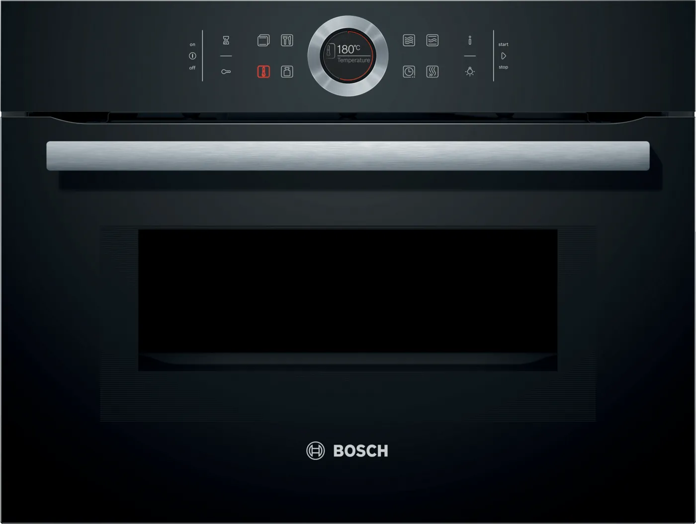 فر مایکروویو کامپکت توکار بوش مدل CMG633BB1 مجهز به مایکروویو، گریل، کانوکشن است و گزینه هایی مانند بخارپز و جوجه گردان را ندارد.
