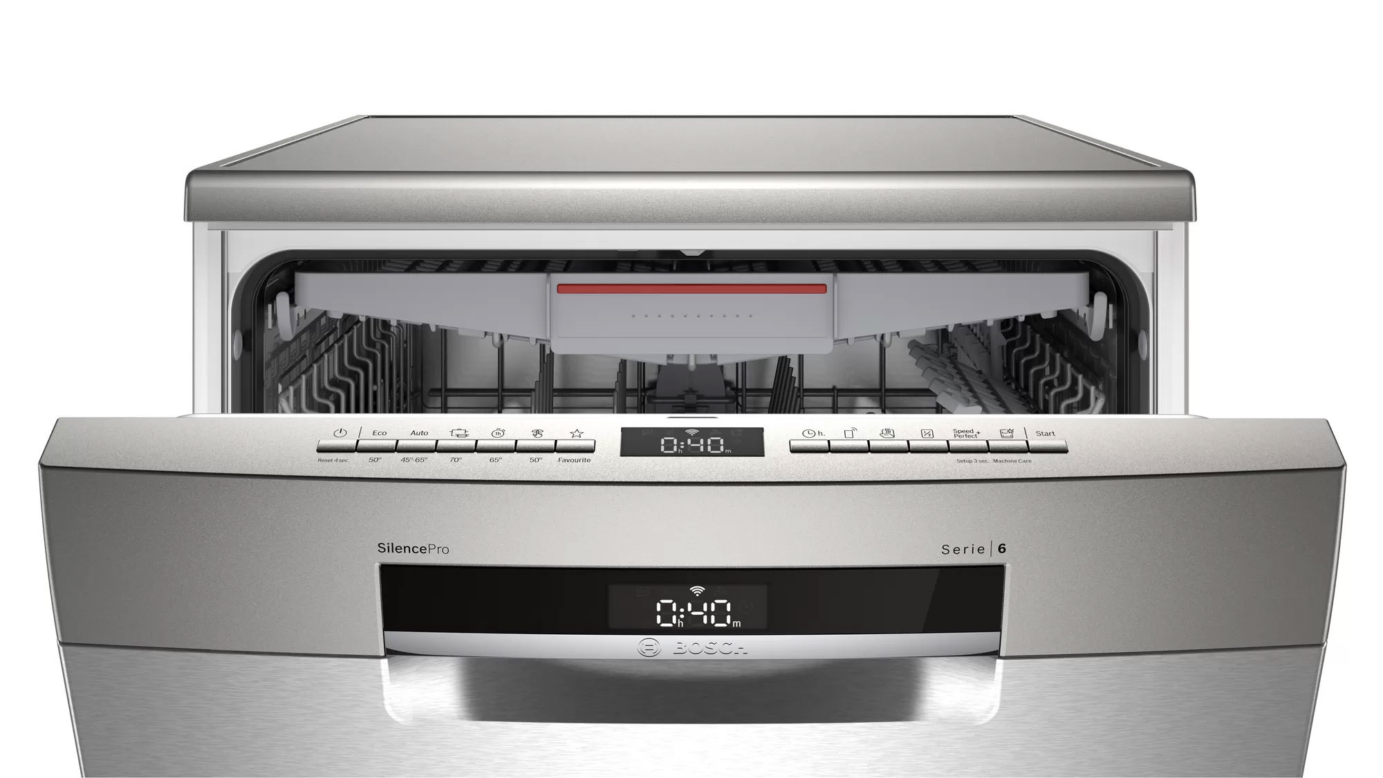 درب ماشین ظرفشویی بوش مدل SMS6ECI07E دارای قابلیت باز شدن 90 درجه ای است و به راحتی می توانید سبدها را بیرون بیاورید و ارتفاع آن ها را تنظیم کنید. ارتفاع سبدها بین 3 الی 5 سانتی متر قابل تغییر است و می توانید از دستگاه ذبرای شستشوی ظروفی که سایز بزرگی دارند مانند قابلمه و ماهی تابه استفده کنید.