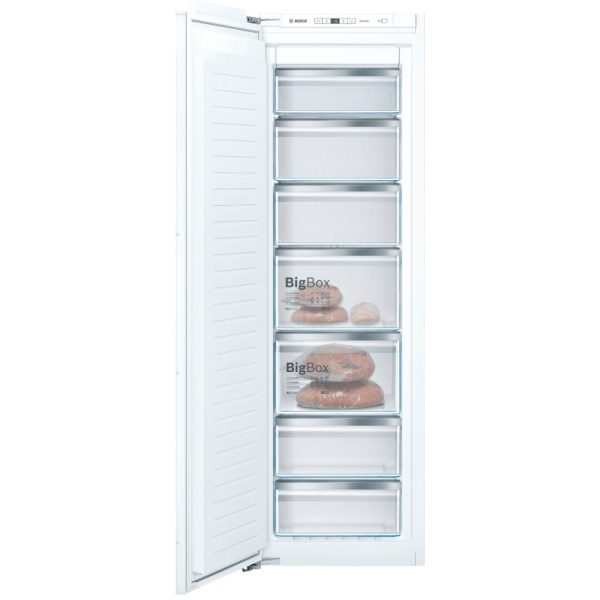 قسمت فریزر یخچال فریزر توکار بوش KIR81AF30-GIN81AE30 دارای 2 کشوی شفاف است که یکی از آنها BIG BOX بود و میتوانید حجم زیادی از مواد غذایی شما را در خود جای دهد. اگر شما فراموش کردید درب فریزر را ببندید، این دستگاه دارای سیستم صوتی و بصری هشدار دهنده بوده و در صورت اختلال در کارکرد بخش فریزر شما را آگاه میکند. روشنایی داخل آن از طریق نورهای LED فراهم میشود که حرارتی از خود ساطع نمیکنند و دید واضح و روشنی از مواد غذایی را در اختیار شما عزیزان قرار میدهد. ظرفیتی که برای یخچال این دستگاه در نظر گرفته شده برابر 319 لیتر و ظرفیت فریزر نیز 211 لیتر میباشد.